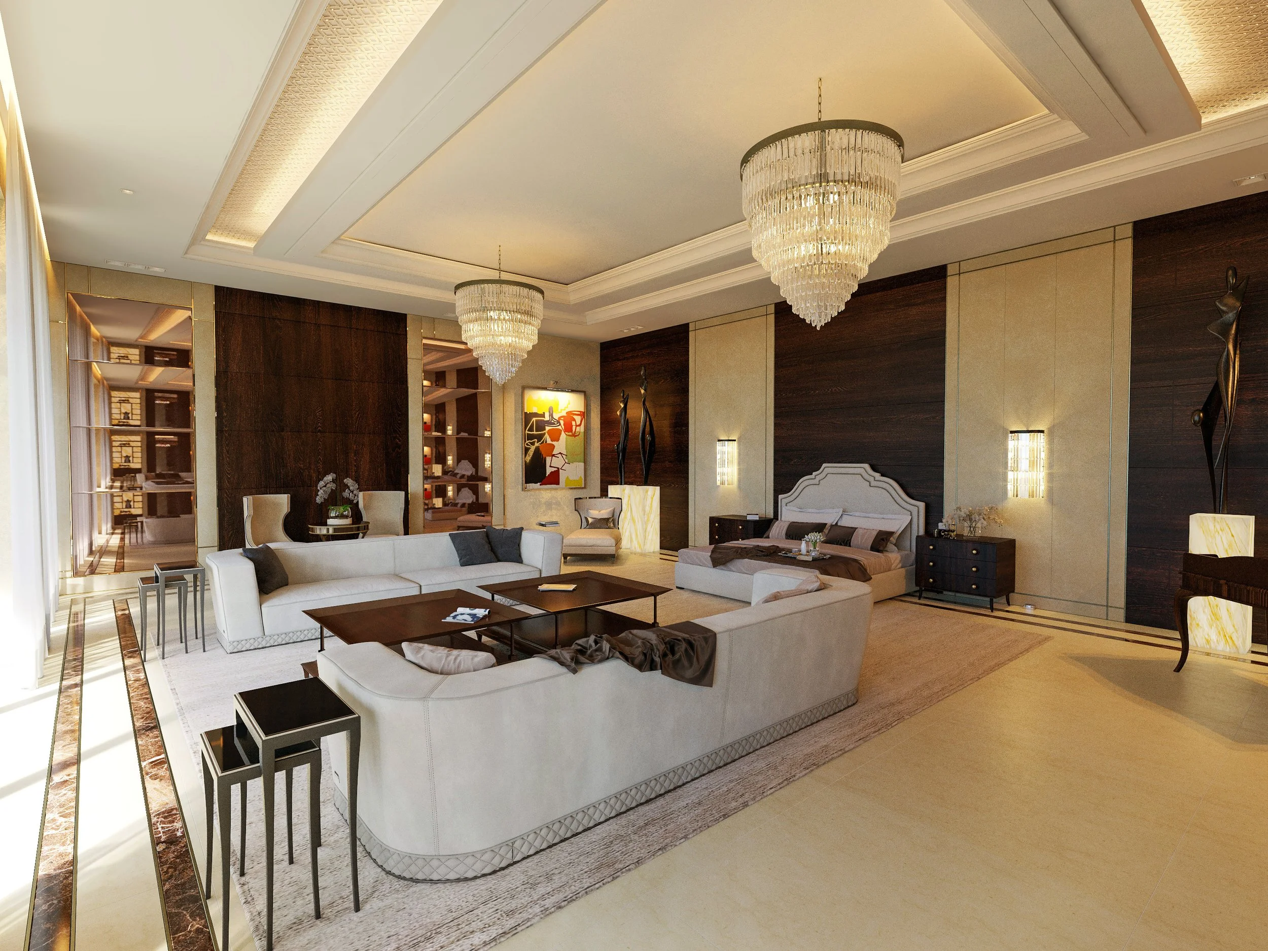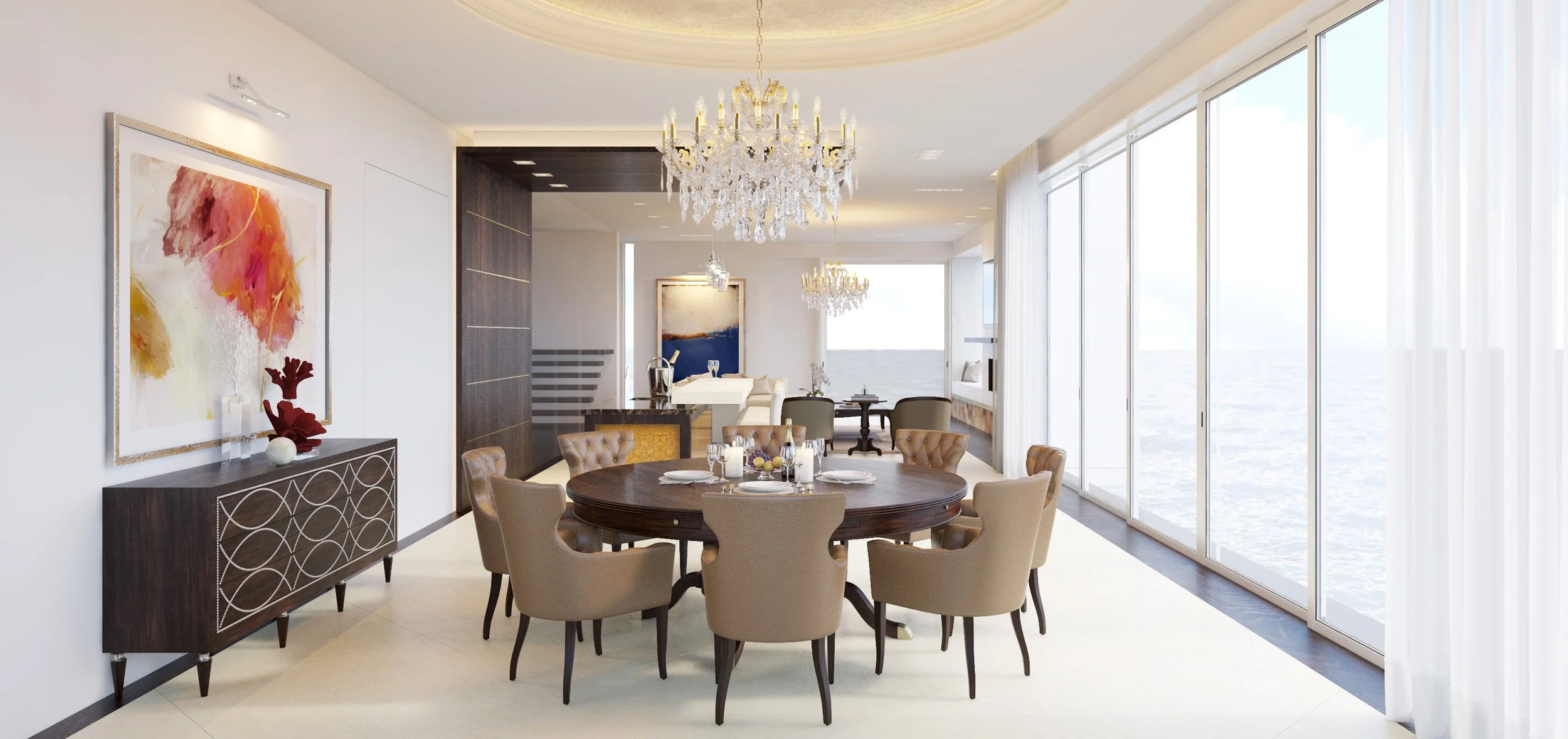 Custom crystal chandeliers, intricate millwork, curated materials, and richly layered textures bring the space to life, creating a sense of timeless sophistication against the backdrop of the Atlantic Ocean. The result is a villa that feels both monumental and intimate — a place where craftsmanship, artistry, and luxury reach their highest expression.