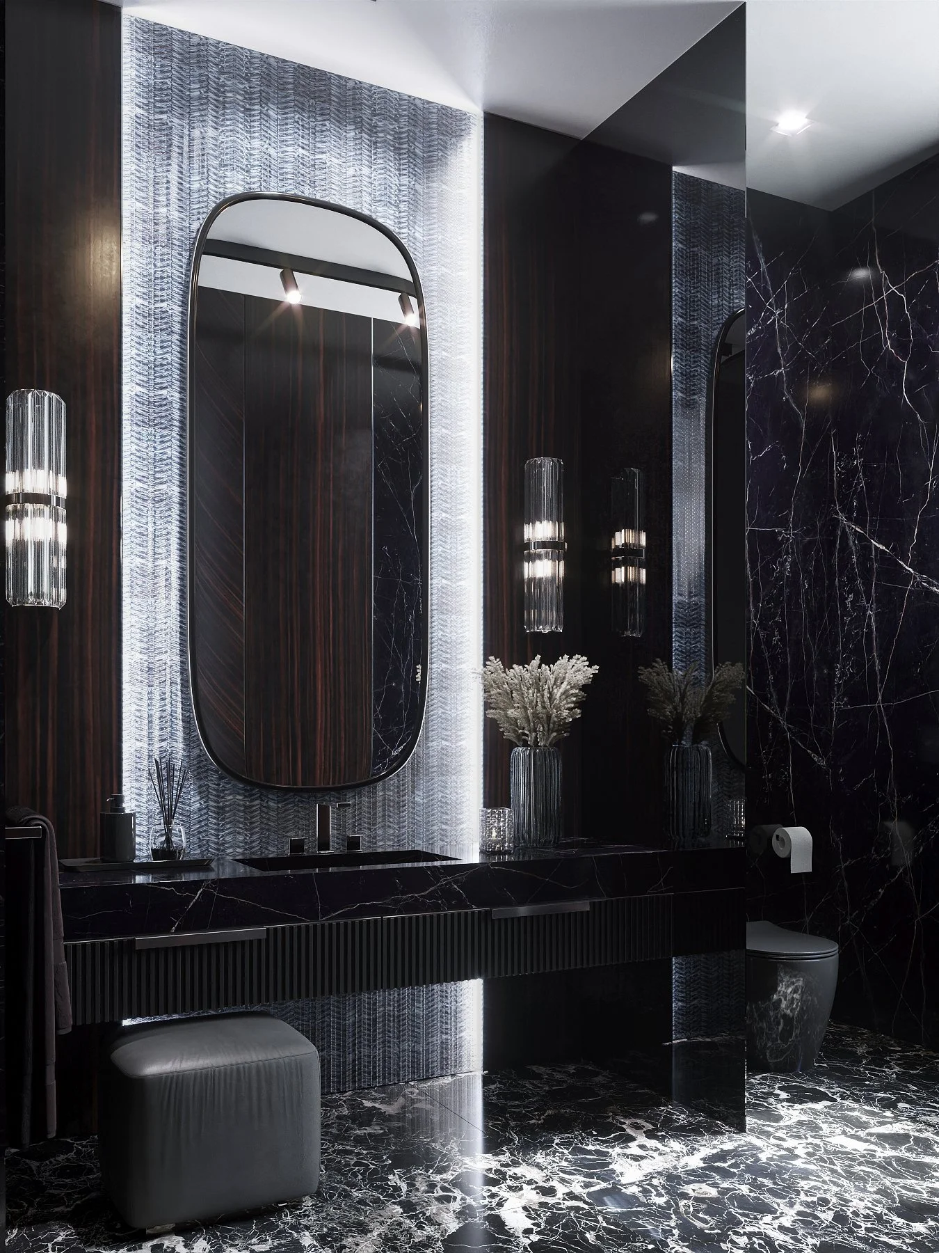 The design is a masterclass in monochrome minimalism. The client requested a strictly black-and-white world — a space purified of distractions, stripped to its essence, and amplified through glossy finishes, reflective surfaces, and crisp geometric lines. Wood was almost entirely eliminated. Instead, the drama comes from form, contrast, proportion, and light.