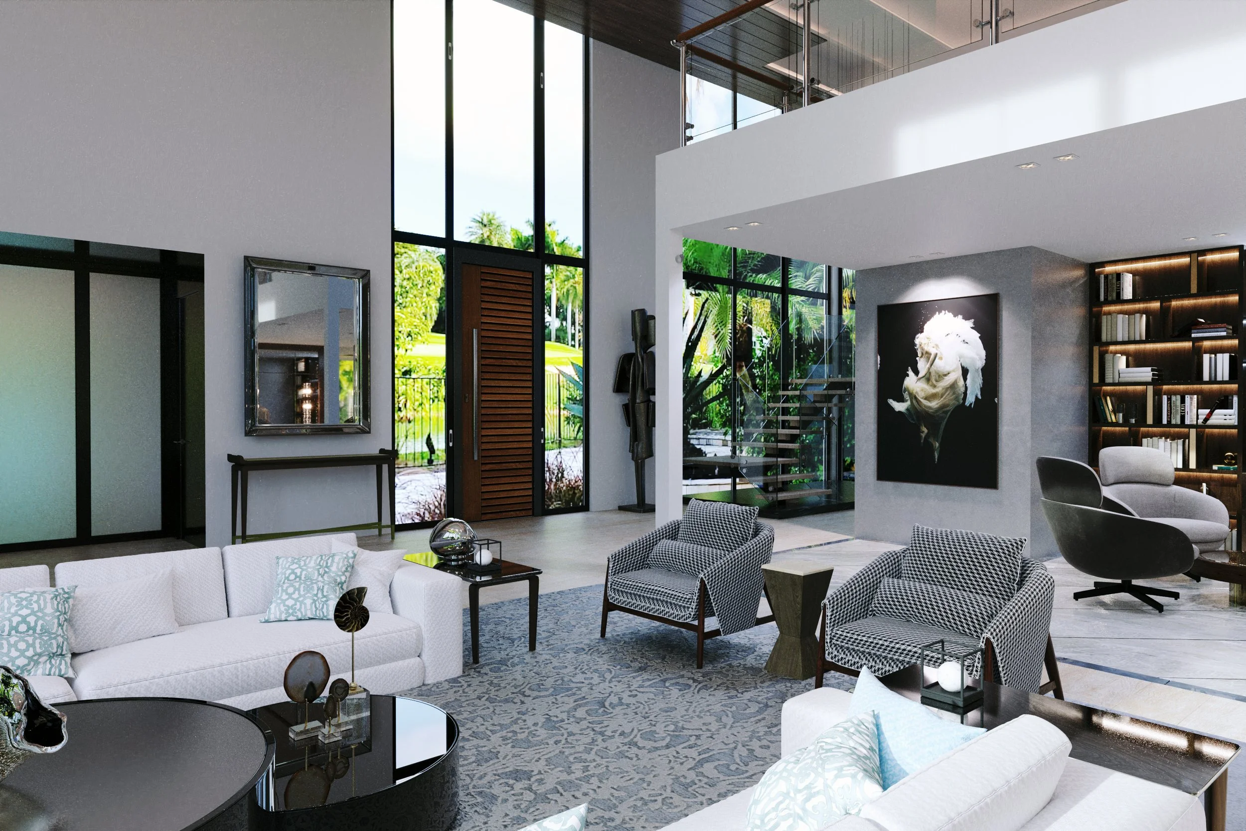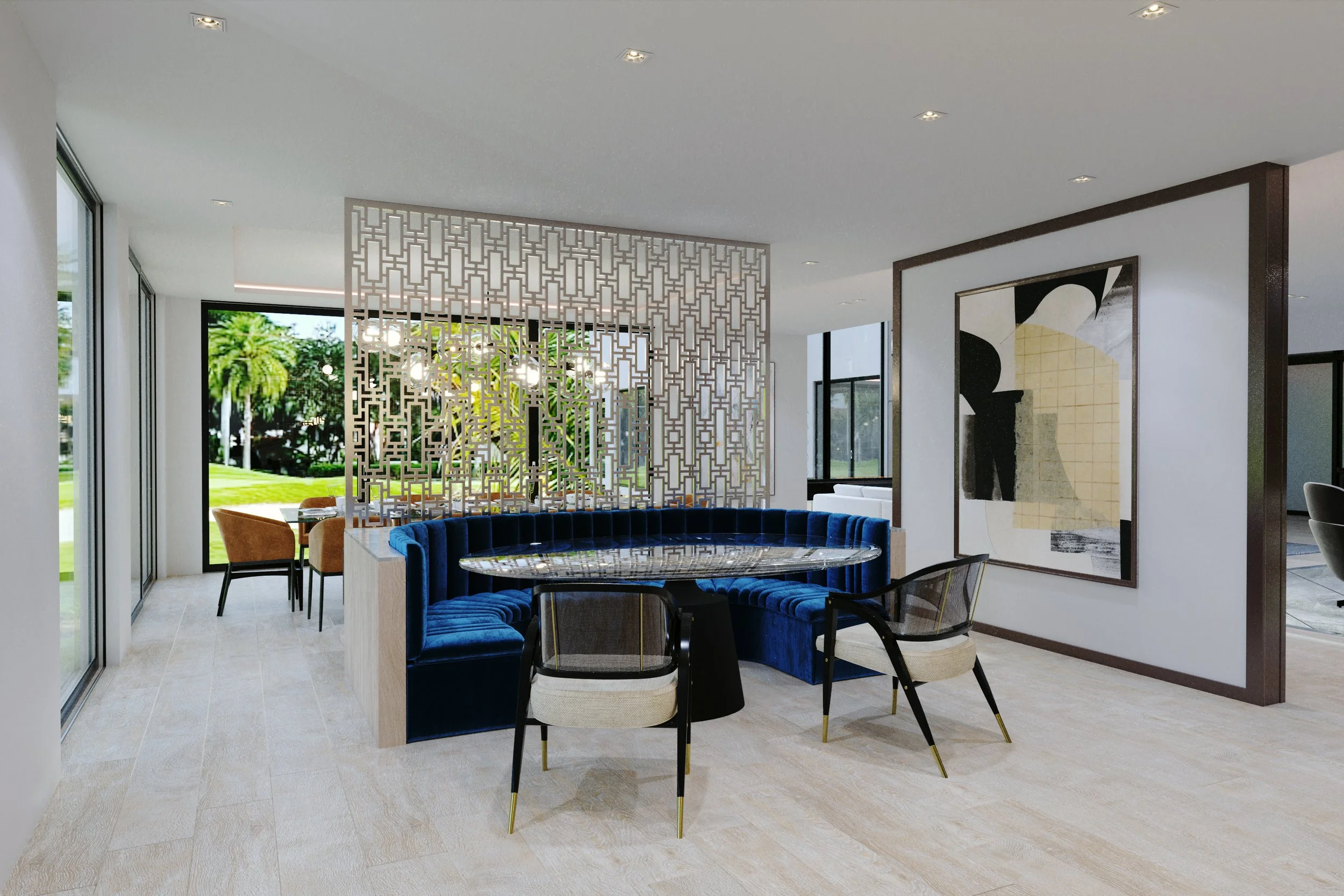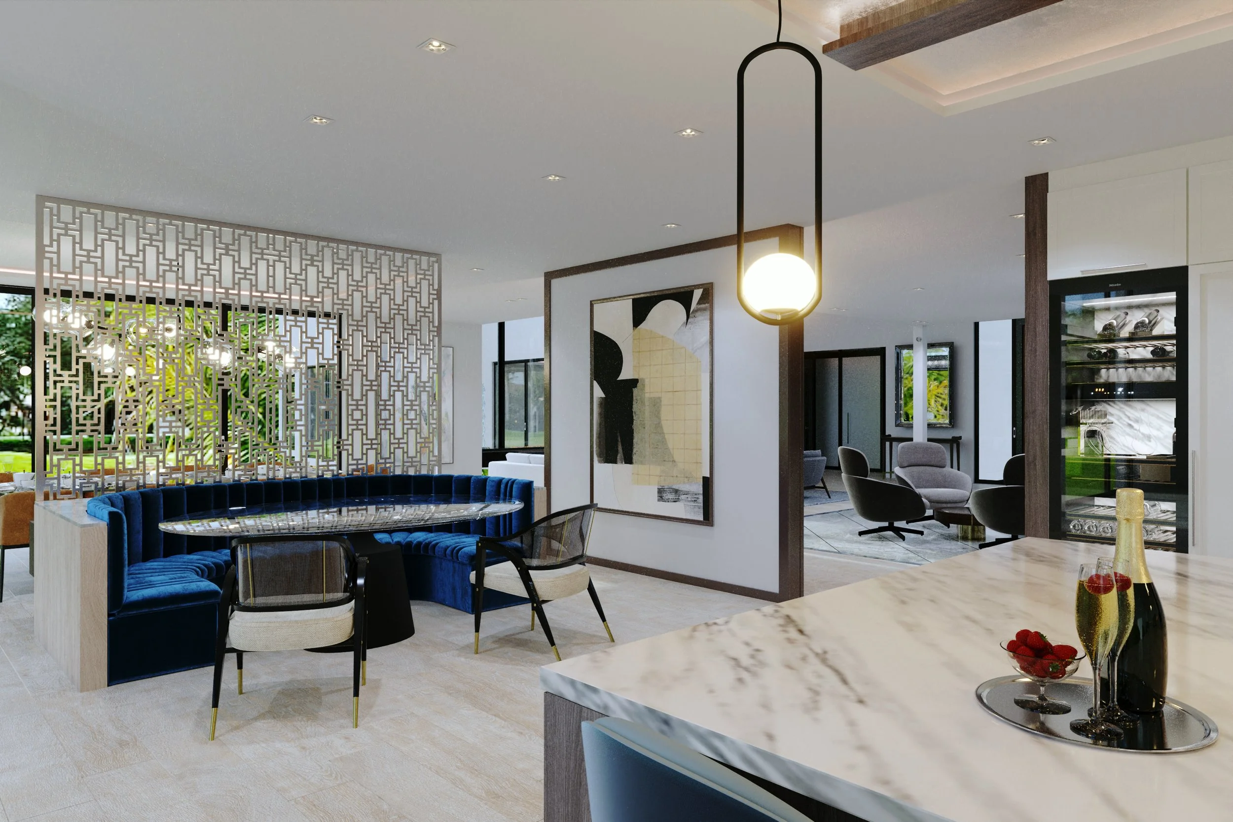 The design combines contemporary elegance with subtle New York influences, reflecting the clients’ roots while embracing Florida’s “endless summer” lifestyle. The result is a refined yet welcoming home that feels both metropolitan and relaxed.